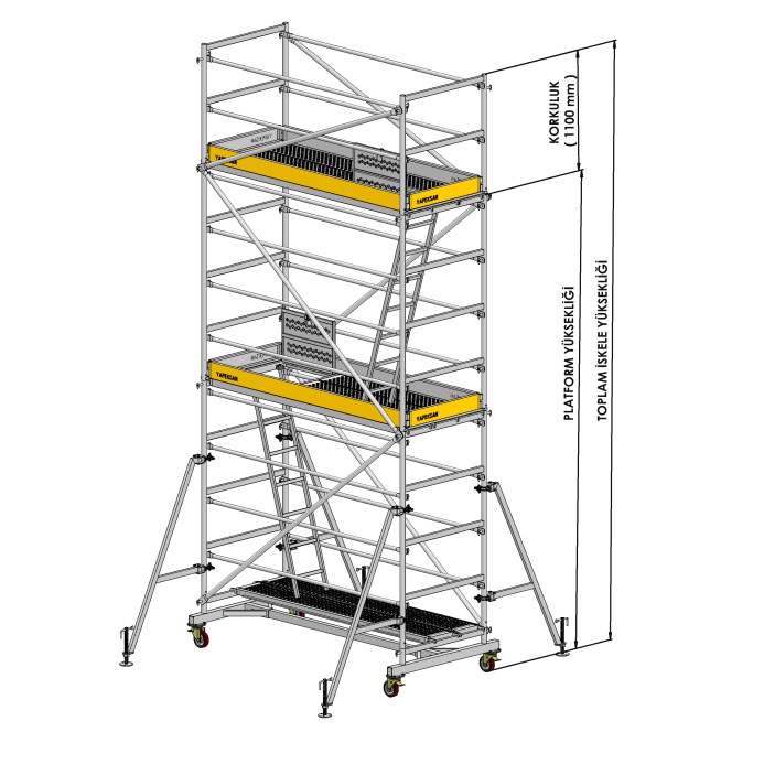 Височина на работната площадка (платформа): Под височина на работната площадка следва да се има в предвид нивото, на което стъпват краката на работника и към нея трябва да се добавят предпазните хоризонтални парапети - 110см, с които се формира общата
